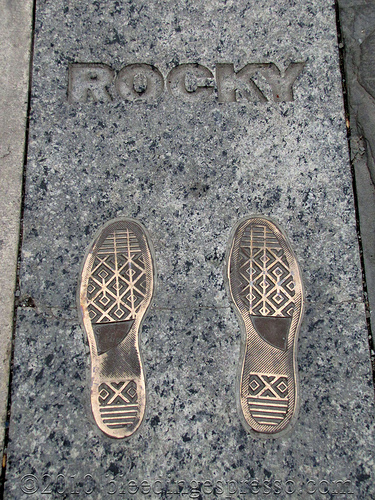 ・フィラデルフィア美術館にはロッキーの銅像が立っている。しばらく映画のシーンと同じ場所にあったが、今は美術館内の庭園に移されたそう。足跡はそのまま残っている。