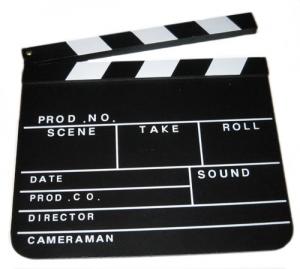 ★同時録音の映画撮影をするときにカメラの前で打ち鳴らす小さな黒板の付いた拍子木を何というか